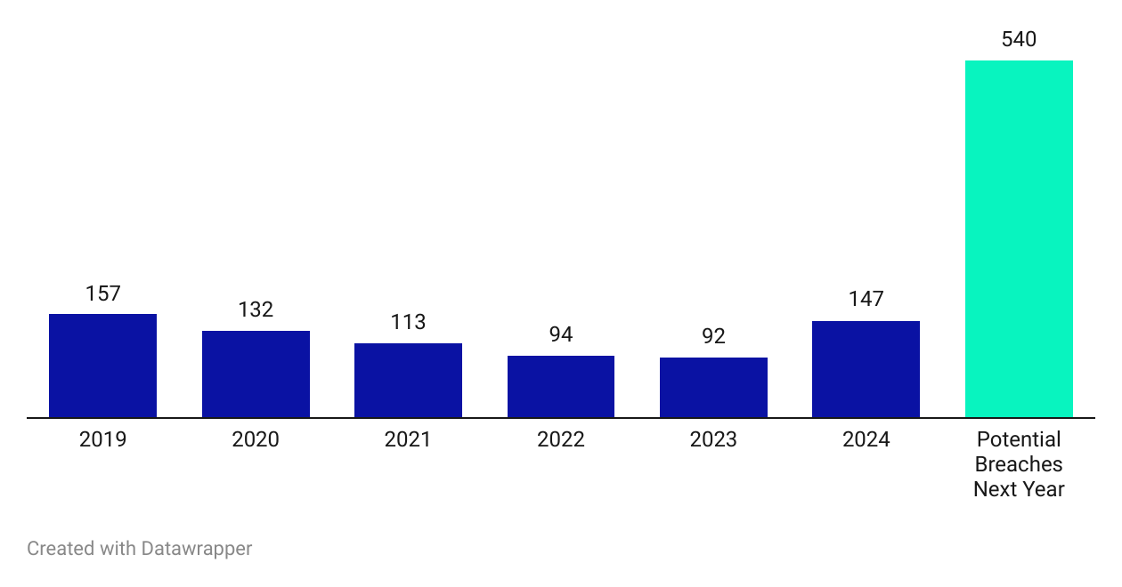 If company breaches follow Microsoft's projected 4.5-times increase, Australia could see 540 breaches in 2025, up from 147 in 2024. This would impact an estimated 715,500 people through company breaches alone, an increase of 568,353 individuals.