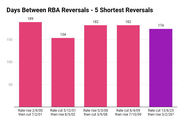 - 154 days Fastest-ever reversal (2001-02), the only time the RBA flipped policy faster