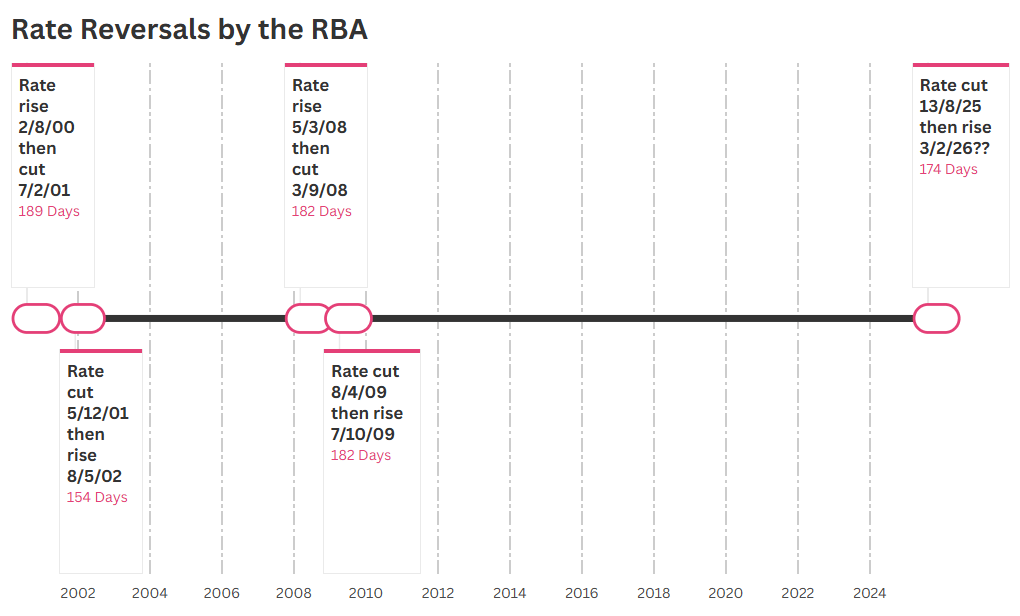 The only faster turnaround occurred in 2001-02, when the RBA flipped from cut to hike in 154 days. Then, the RBA cut rates fearing a severe global downturn, only to hike months later stating the economic climate had "changed markedly" and "the outlook no longer warranted" their previous stance. Both reversals share the same pattern: rapidly changing conditions that contradicted the RBA's initial assessment.